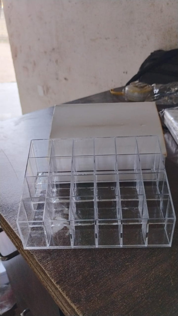 - Save your time and effort by keeping everything in one place with this great clear acrylic cosmetic stand. The top stand has been divided into 24 versatile compartments ideal for brushes, creams and lipsticks.
